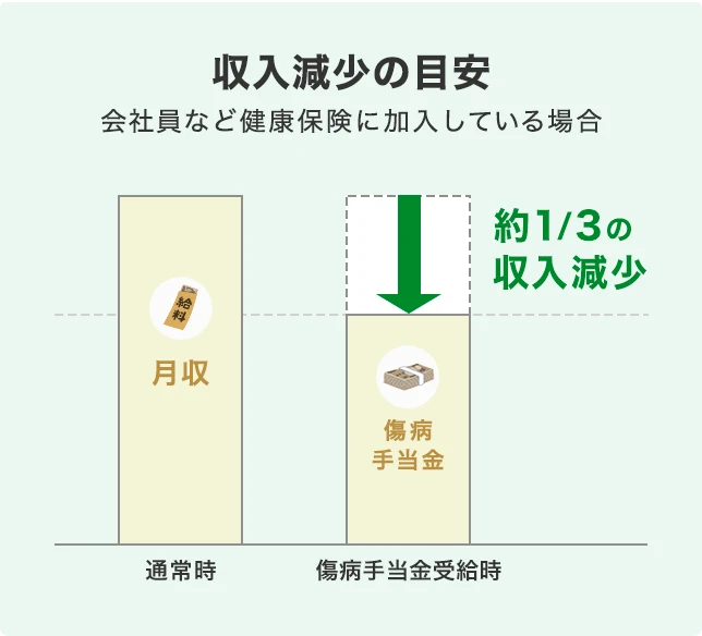 万が一働けなくなると、会社員の方は一般的に傷病手当金※を受給できますが、月収は約2/3に減少し、さらに賞与も受け取ることができなくなる恐れがあります。